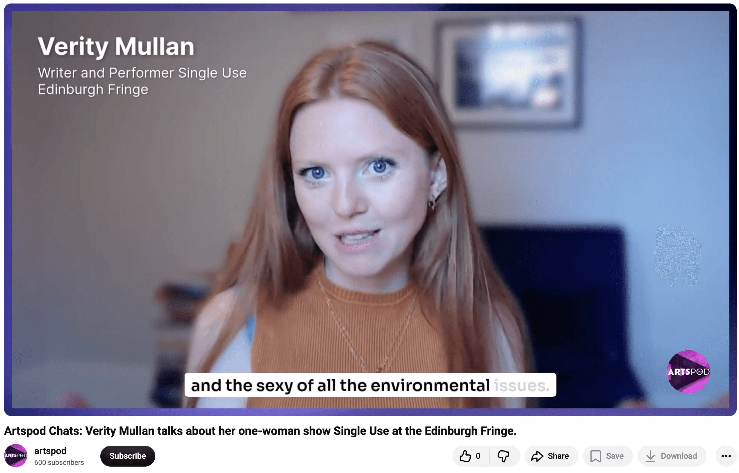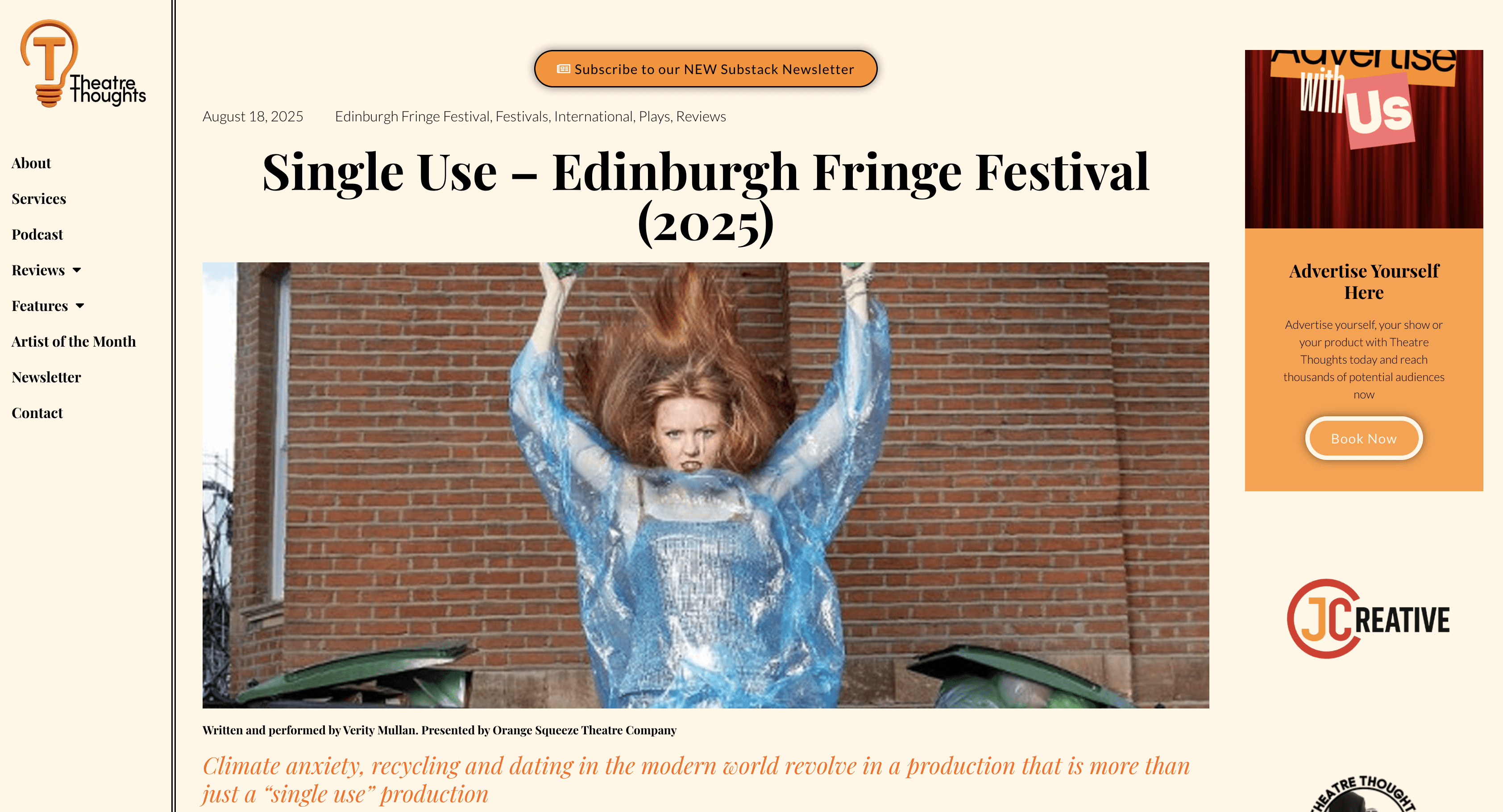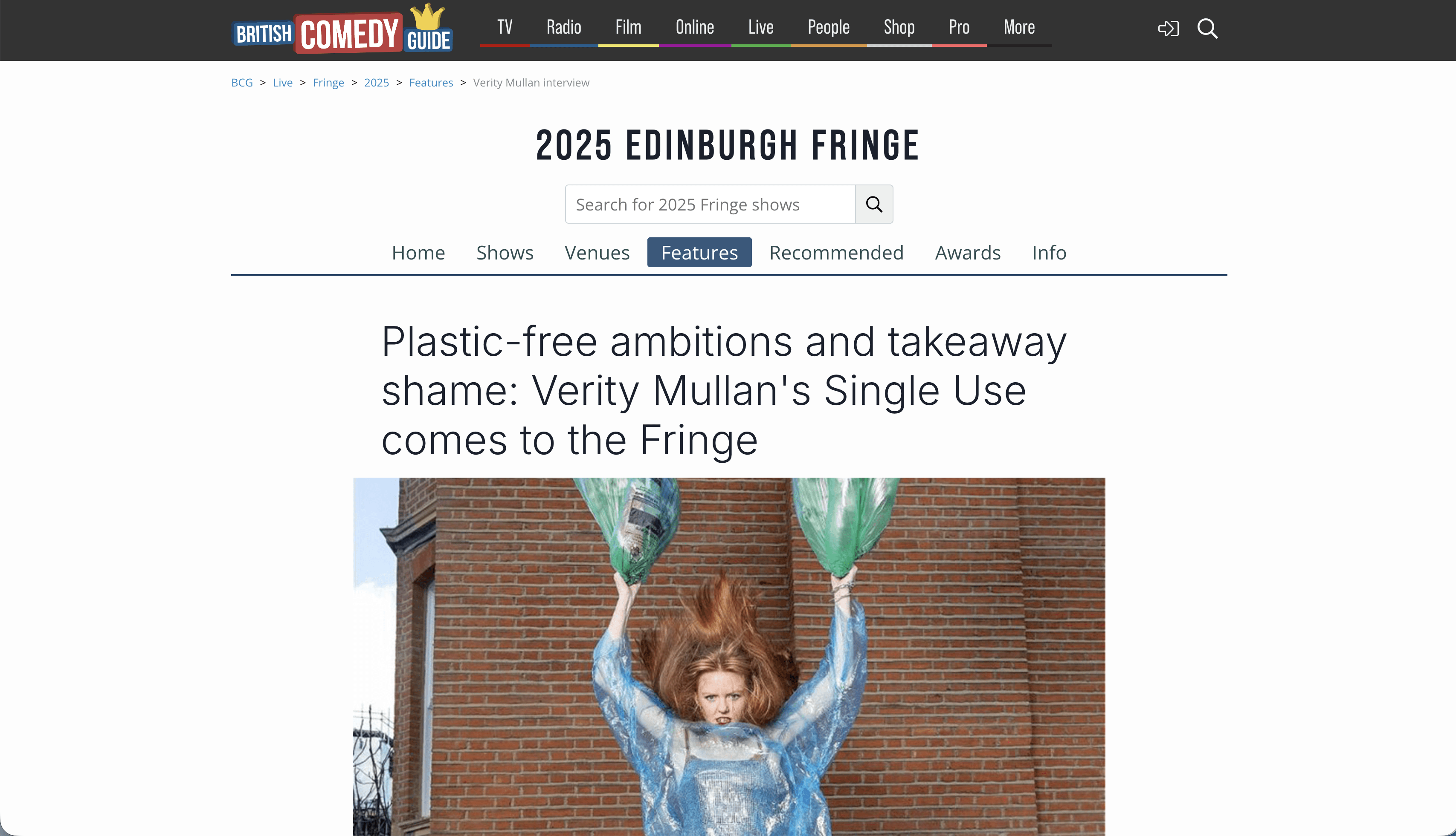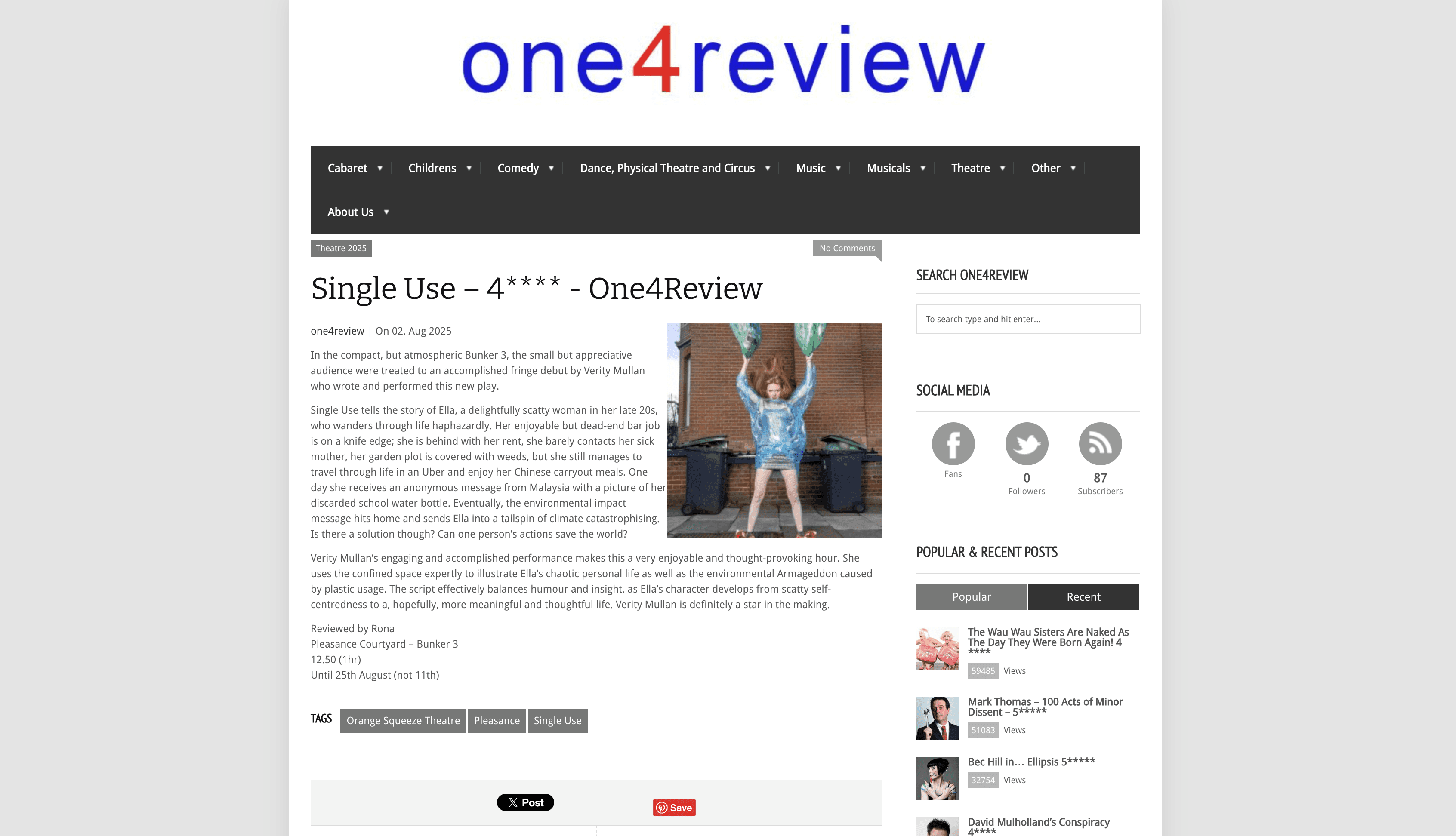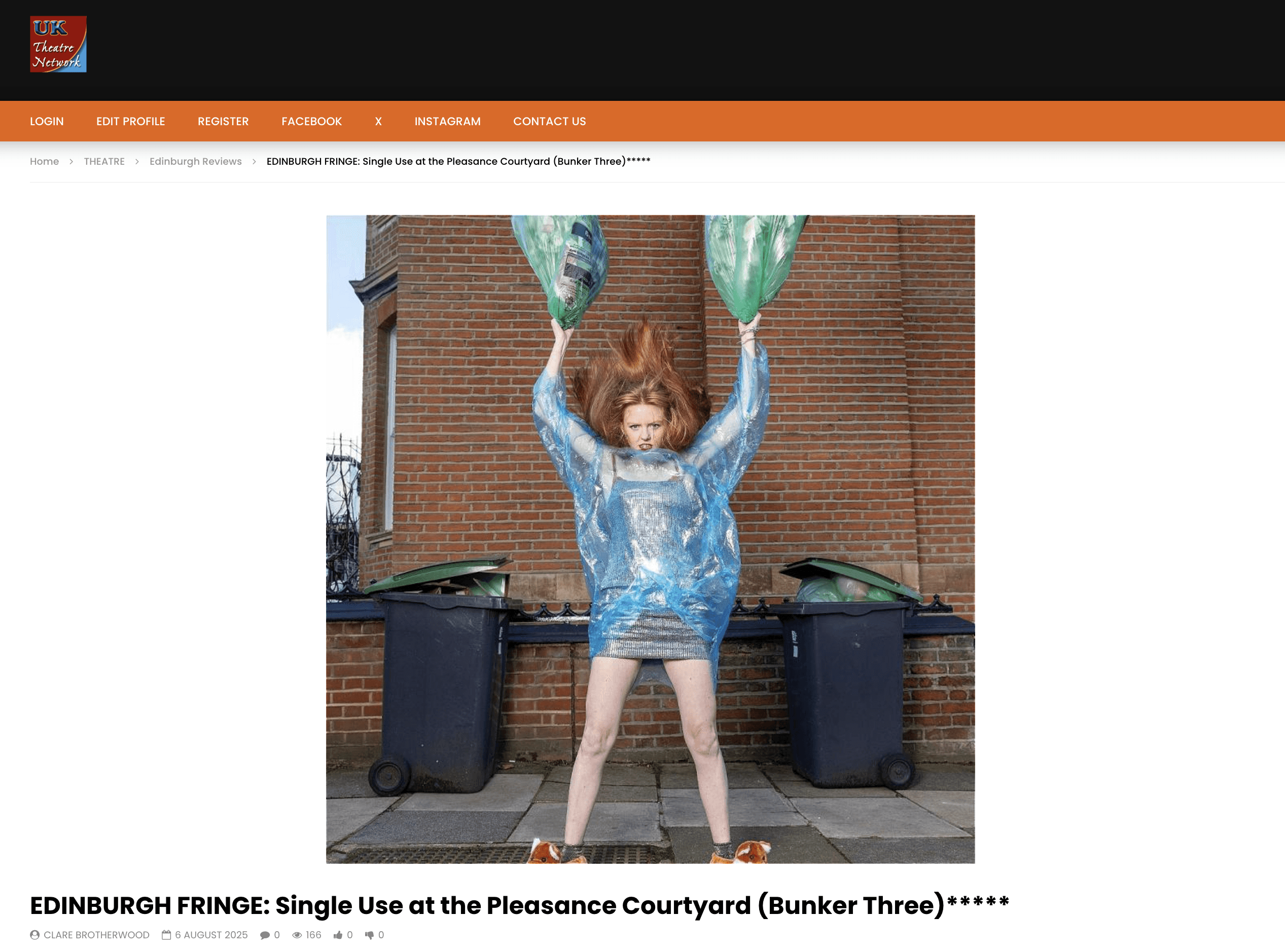 "Comedy, chaos and a lasting message…Verity Mullan’s sharp observation of one of the biggest scourges on society unpicks the uncomfortable relationship between personal responsibility and environmental collapse." – ★★★★★